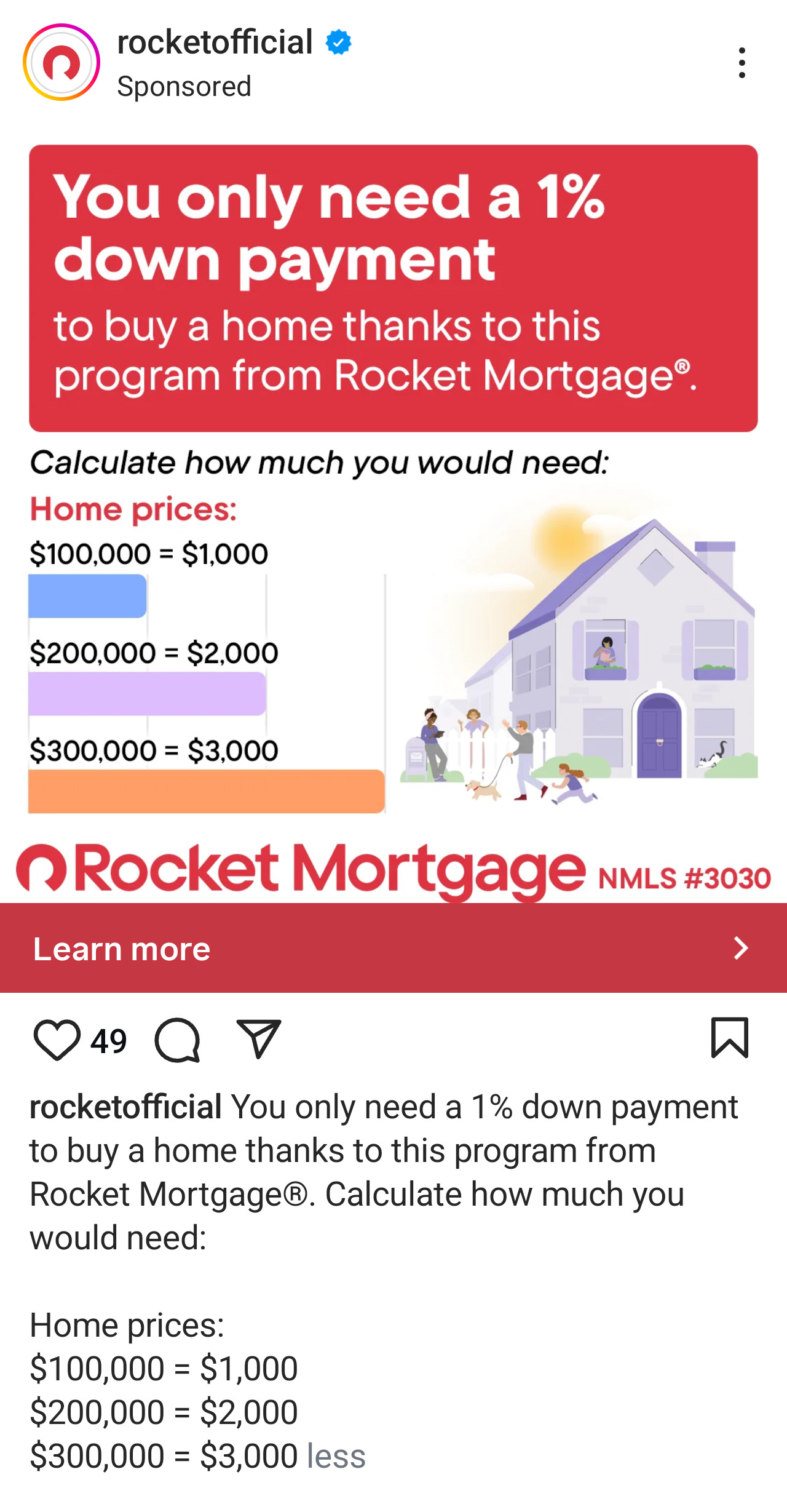 Client will be required to pay a 1% down payment, with the ability to pay a maximum of 3%, and Rocket Mortgage will cover an additional 2% of the client’s purchase price as a down payment, or $2,000. Maximum grant amount is $7,000. Offer valid on primary residence, conventional loan products only. Maximum loan amount of $350,000. Cost of mortgage insurance premium passed through to client effective January 2, 2024. Offer valid only for home buyers when qualifying income is less than or equal to 80% area median income based on county where property is located. Not available with any other discounts or promotions and cannot be retroactively applied to previously closed loans or loans that have a locked rate. This is not a commitment to lend. Rocket Mortgage reserves the right to cancel/modify this offer at any time. Additional restrictions/conditions may apply.