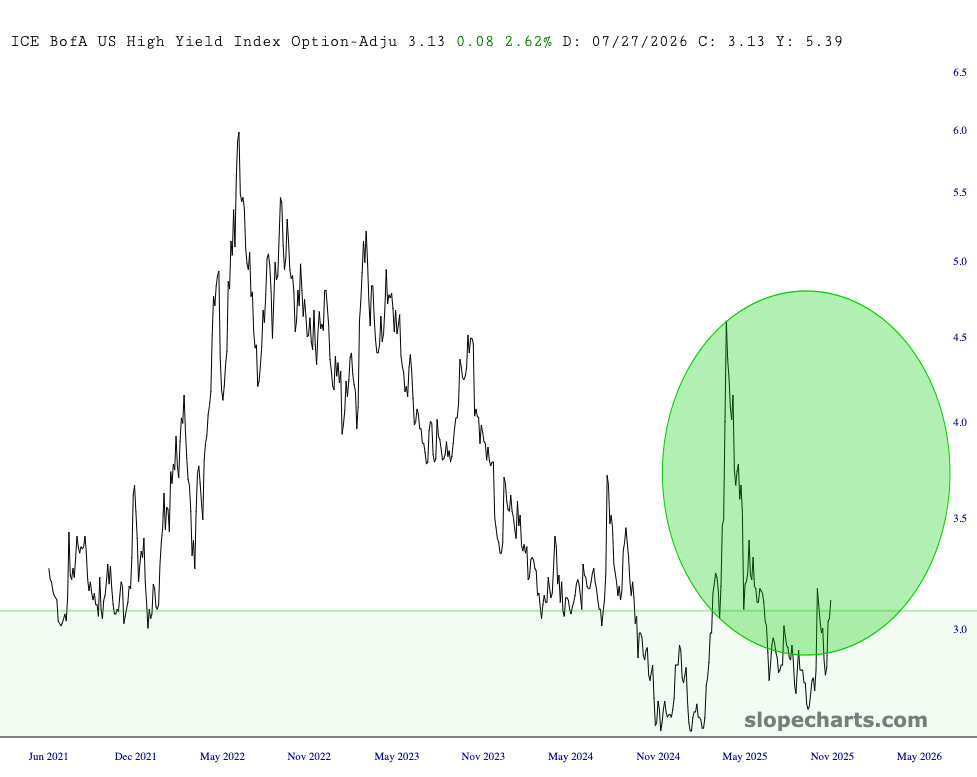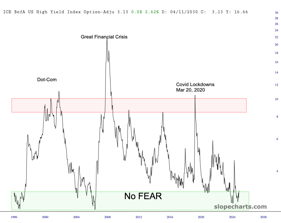 In the background you have BofA AAA credit spreads oscillating back and forth between No Fear (Green) and Fear (Red). You can see the correlating moves in the S&P when credit spreads were at either extremes.