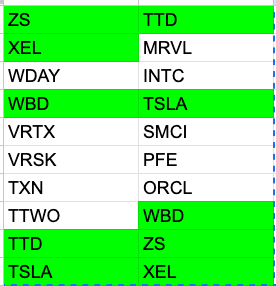 Looking at the top 10 of both lists, the green highlights are duplicates. So we have 15 distinct tickers with Grok’s reasoning.