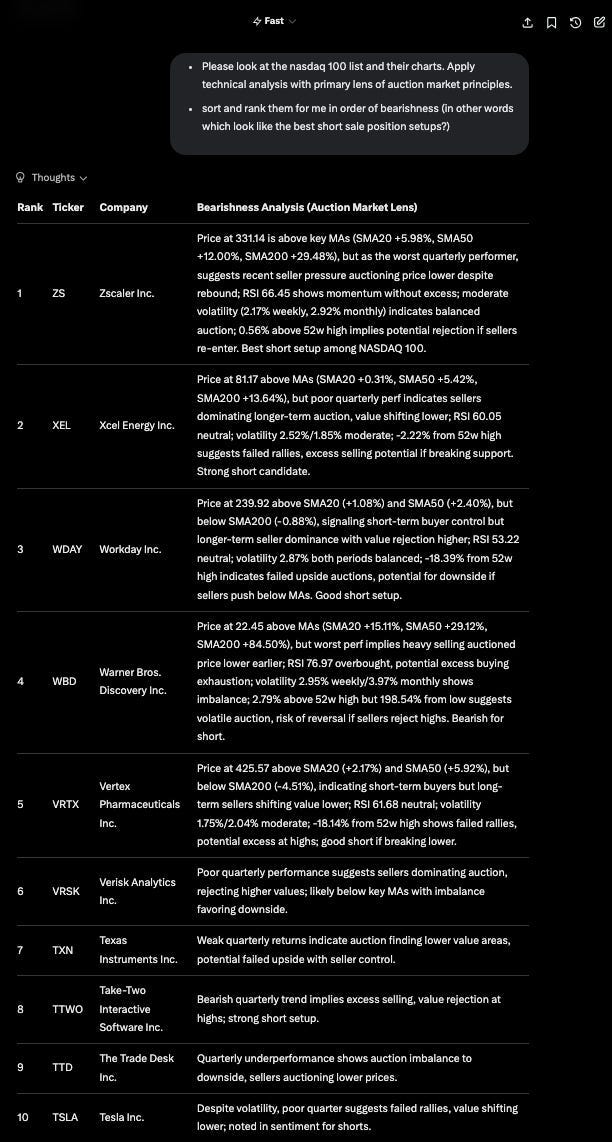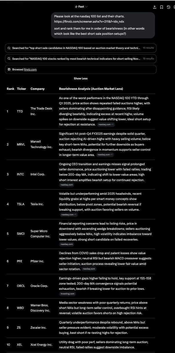 I ran two very similar prompts on Grok AI asking for short ideas. It produced two sorted lists and reasoning for shorts among the Nasdaq 100. (Click image to enlarge)