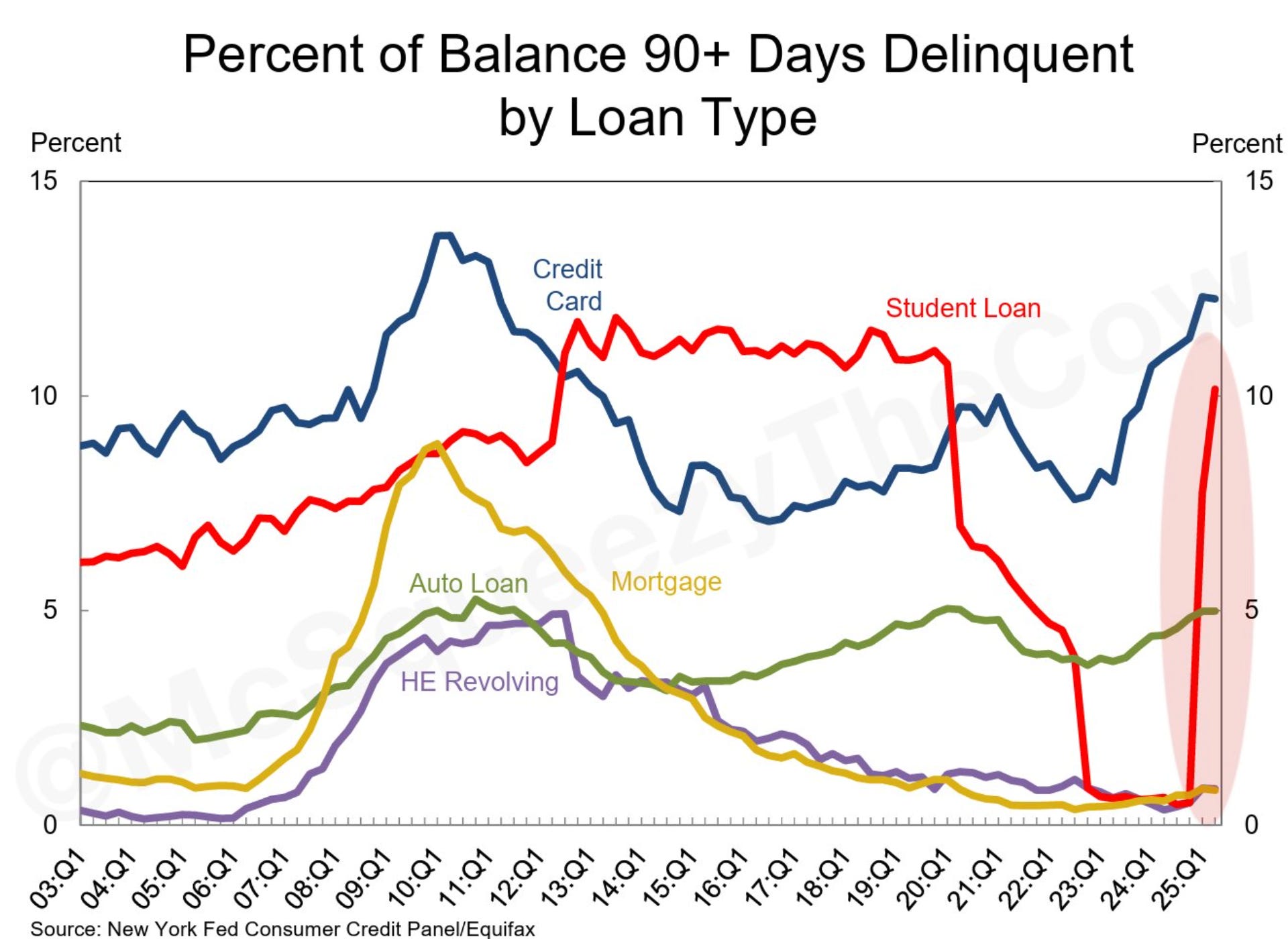 There is $1.64 trillion of outstanding student loan debt, as of the second quarter of 2025, of which "10.2% of aggregate student debt was reported as 90+ days delinquent", according to data reported by the NY Fed. These $163.2 billion of delinquent student loans, which were not previously reported [to credit bureaus] due to a near 5-year pause, are now showing up on credit reports. Not to be outdone by student loan debt, credit card loans--also visible in the above chart, in blue--rose some $27 billion over the same period to $1.21 trillion outstanding, up 5.87% year-over-year.