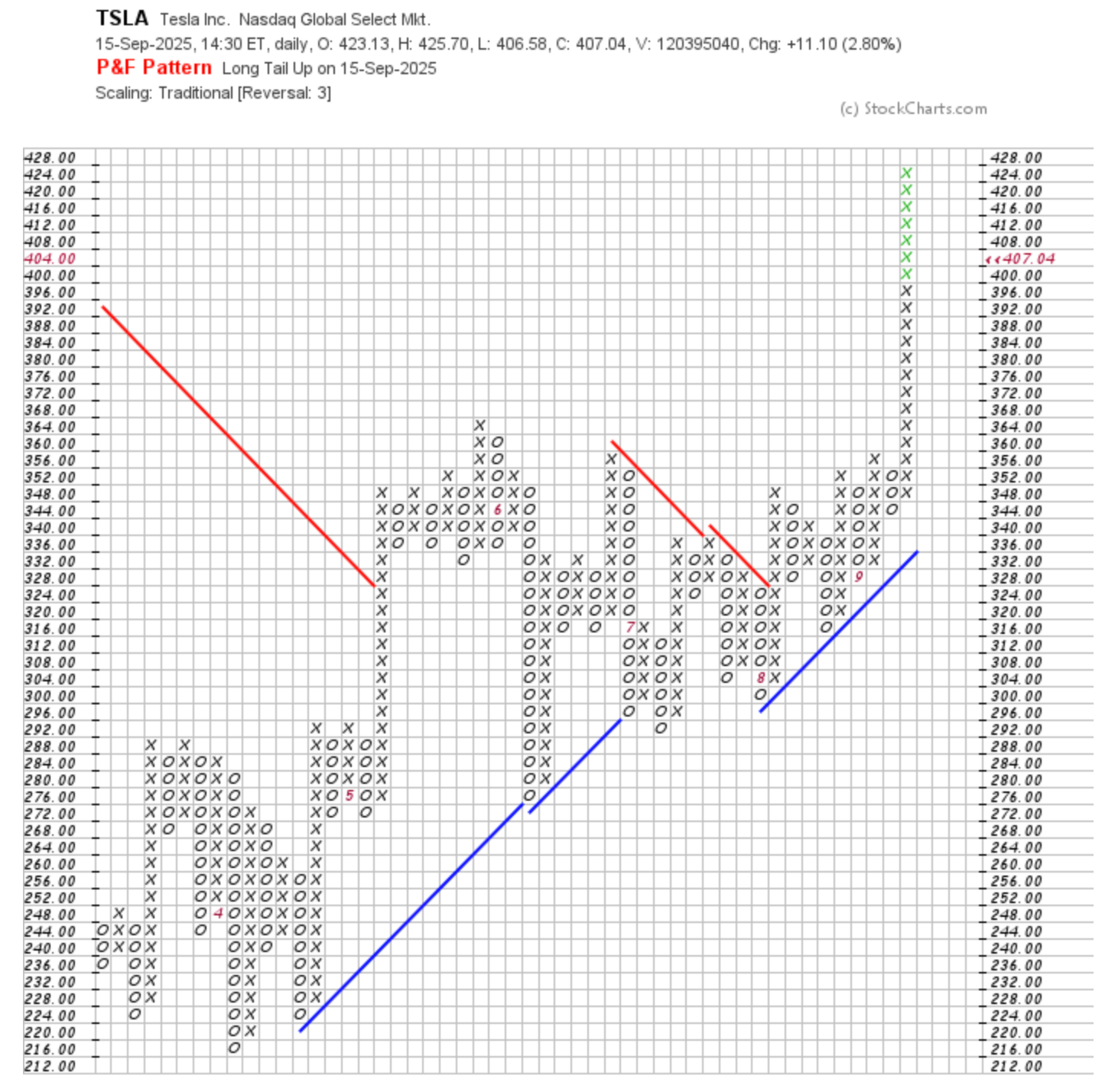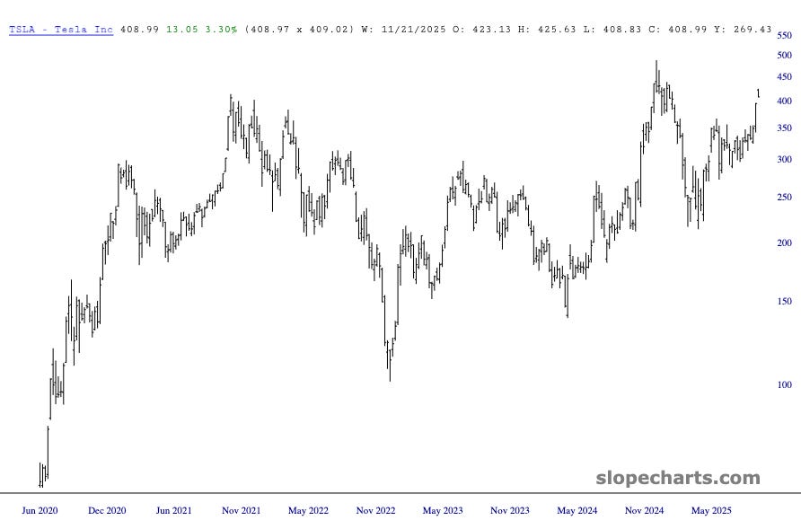 Weekly chart of TSLA: repelled at $410 ish area twice before. Will 3rd time prove the charm?