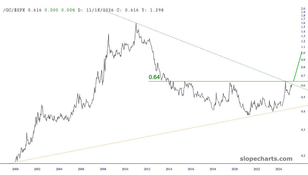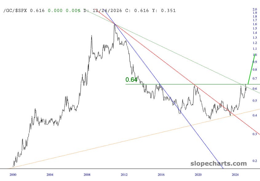 Last macro view. Here is Gold vs S&P 500 ratio chart. Since 2010 the S&P beat Gold, but it seems this is also beginning to flip. Gold is up 63% YTD, Silver 96%, SPY 16%.