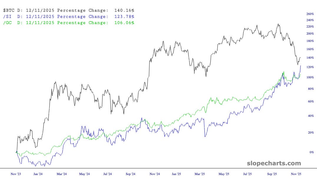 Another interesting view is 2 yr chart of Bitcoin, Silver and Gold. Baton changing hands?
