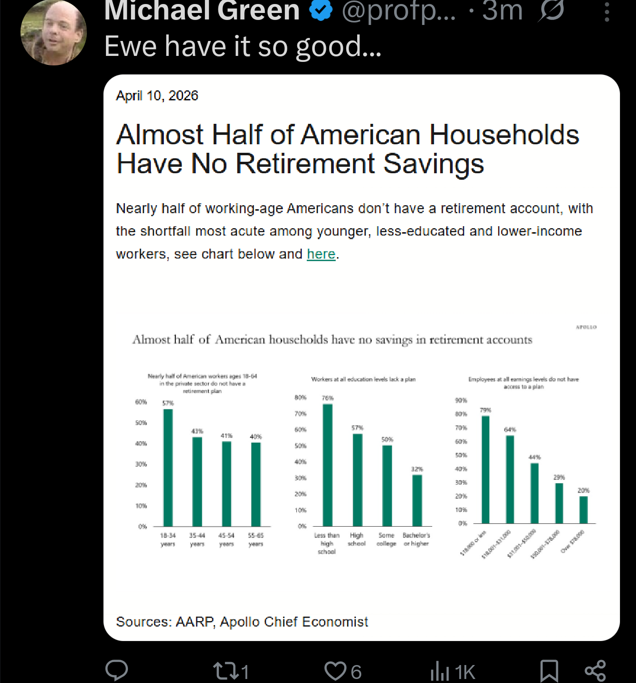Not actual car. But same year and color. One patched up rust spot. But otherwise super clean. I bet it has 300k miles and still can go another 300k. And I also bet he has a retirement fund waiting. Unlike most. Data from Michael W. Green