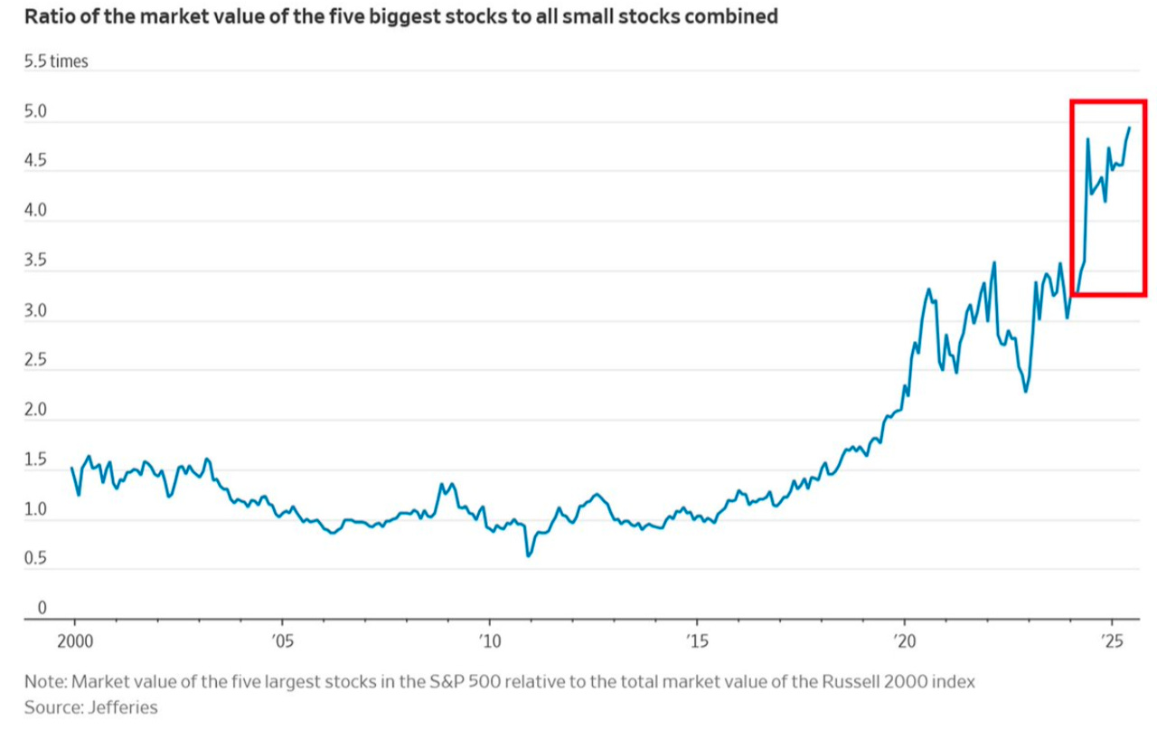 The 5 largest stocks in the US are now 4.9x larger than all small-cap stocks COMBINED, a new all-time high.