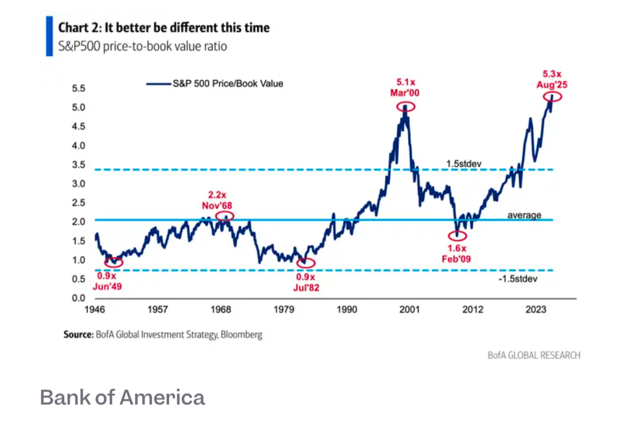 S&P 500 price-to-book ratio at record highs, surpassing dot-com levels.