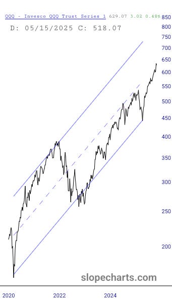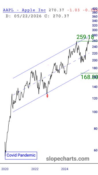 If you look at the price action, we are clearly butting up to the upper edge of an established channel since 2020. Channels don’t necessarily go on forever. Eventually they breakdown or up.