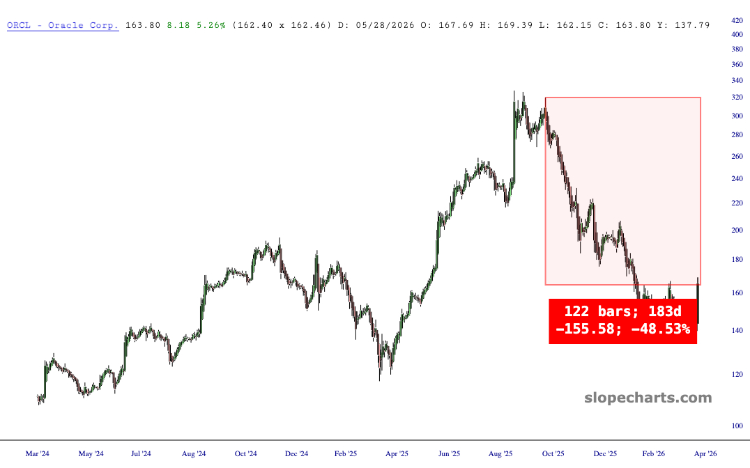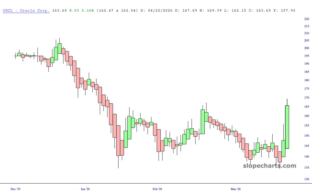 Oracle is surging, extending a powerful two-session rally of roughly 25% as Wall Street re-rates the company as an emerging AI utility rather than a legacy software name. Today's catalysts include Oracle Financial Services extending its agentic AI platform to corporate banking — adding AI agents for treasury, trade finance, and lending — alongside Monday's Bloom Energy deal for up to 2.8 GW of fuel-cell power for Oracle's AI and cloud infrastructure. D.A. Davidson noted investors are returning after a 'severe' selloff, with Oracle's massive $553B remaining performance obligations backlog and new CFO Hilary Maxson reinforcing confidence in capital discipline, helping the stock outperform software peers like Microsoft and Salesforce in a broad tech rebound tied to US-Iran ceasefire hopes.