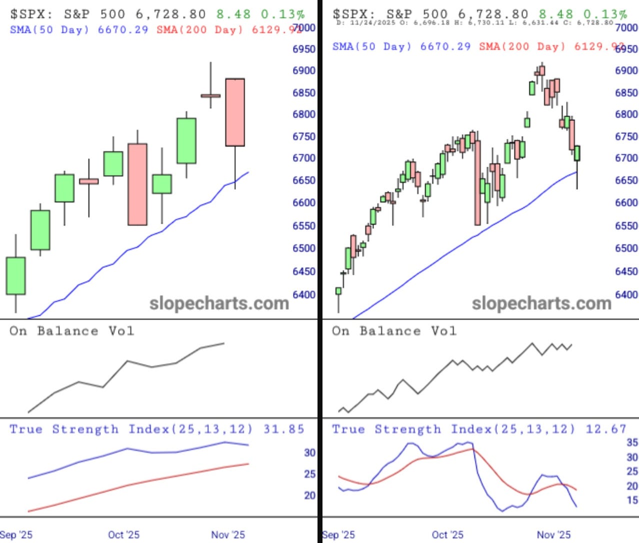 Candlestick reading can sometimes be like tea leaf fortune readings. But in a classical sense, the weekly chart for SPX is a “gravestone doji” with confirmation at the close of Nov 7, 2025.