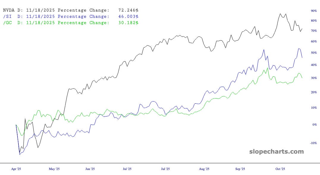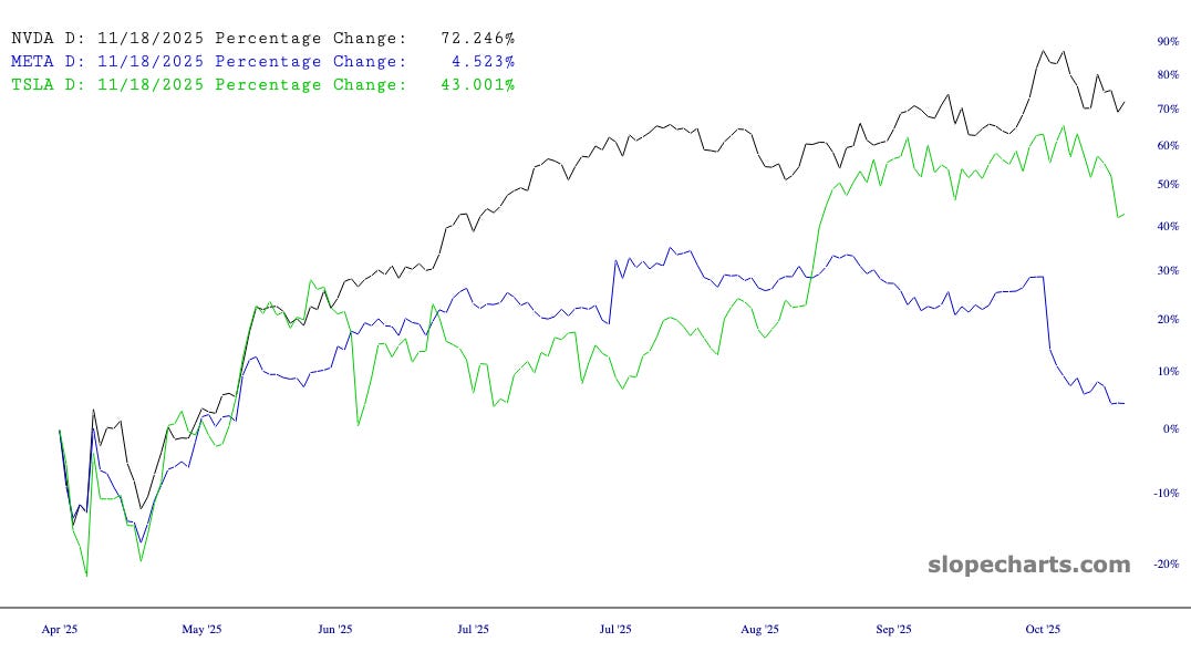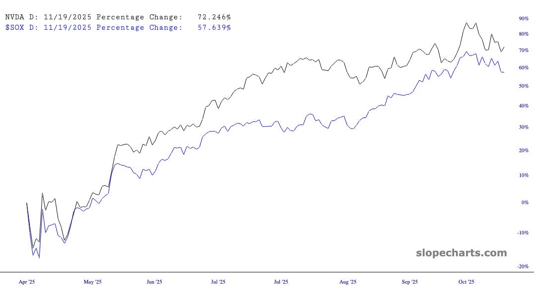 A few comparisons since the April lows. The summary is that most things are rolling over, but NVDA has been trading sideways.